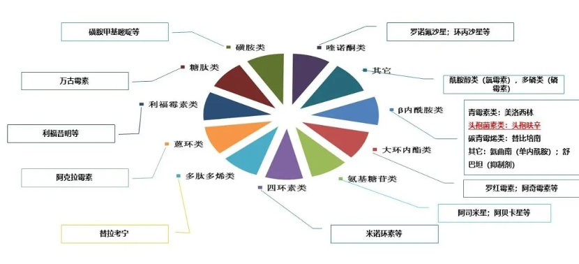 注:磺胺類及喹諾酮類是人工合成的抗感染藥物,嚴格意義上不屬于抗生素。