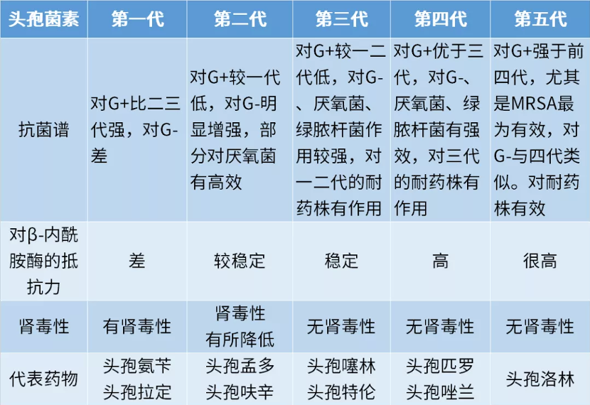 將已上市的頭孢菌素劃分為5類,各類頭孢菌素特征總結(jié)如下表: