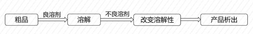 將粗品溶于溶解性好的溶劑(良溶劑)中,然后滴加溶解性不好的溶劑(不良溶劑),通過改變?nèi)莘e比例,進而改變?nèi)軇w系對產(chǎn)品的溶解性,讓產(chǎn)品析出。