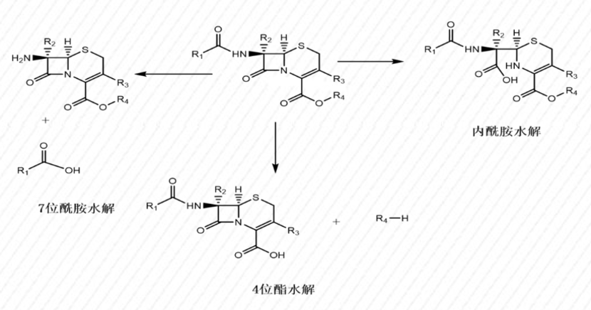頭孢類化合物中官能團較多,且很多官能團穩(wěn)定性差,因此大部分頭孢類化合物,熱穩(wěn)定性、光穩(wěn)定性、酸堿穩(wěn)定性、溶液穩(wěn)定性均相對較差,對于側(cè)鏈及尾鏈中含氮原子較多結(jié)構(gòu)的頭孢化合物,容易氧化。