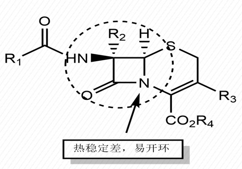 頭孢類化合物熱穩(wěn)定性差、酸堿穩(wěn)定性差、溶液穩(wěn)定性差,部分品種光穩(wěn)定性差。