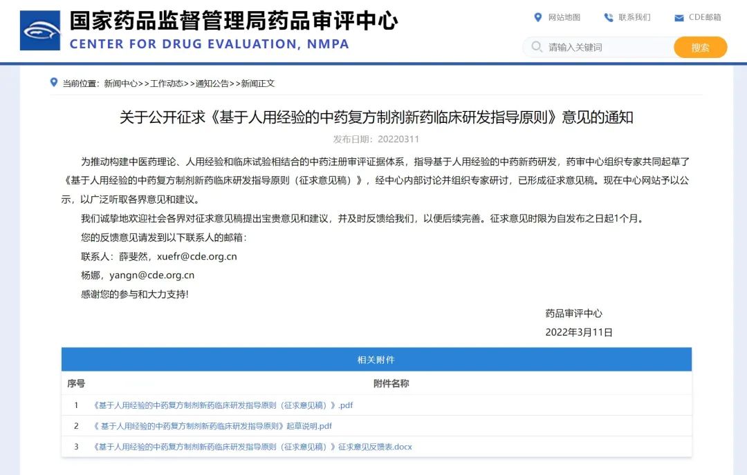 關(guān)于公開征求《基于人用經(jīng)驗的中藥復(fù)方制劑新藥臨床研發(fā)指導(dǎo)原則》意見的通知