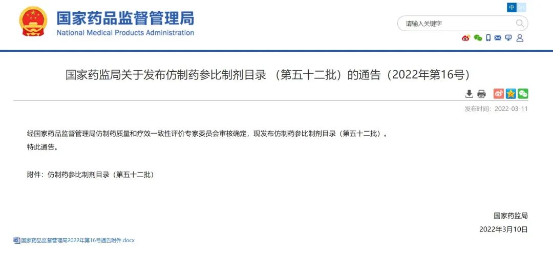 國家藥監(jiān)局關(guān)于發(fā)布仿制藥參比制劑目錄 (第五十二批)的通告(2022年第16號)