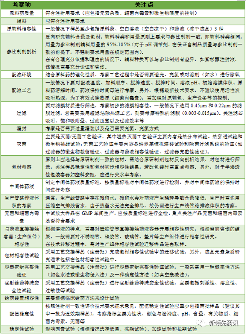 對(duì)于普通注射劑的仿制,不同于口服固體制劑,無需進(jìn)行體外溶出擬合,但對(duì)于質(zhì)量要求更為嚴(yán)格。需以輔料組成(Q1)相同,用量(Q2)相同(仿制藥輔料用量為參比制劑相應(yīng)輔料用量的95%~105%)為前提,對(duì)原輔包的質(zhì)量、滅菌工藝、配伍穩(wěn)定性、安全性及相容性等進(jìn)行嚴(yán)格的考察。