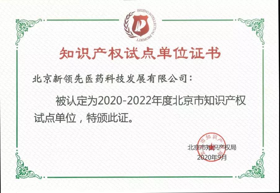 北京新領先醫(yī)藥科技發(fā)展有限公司被北京市知識產權局認定為“北京市知識產權試點單位”。此次認定是新領先繼2019年成功通過知識產權管理體系認證后,榮獲的又一項知識產權相關的榮譽資質。