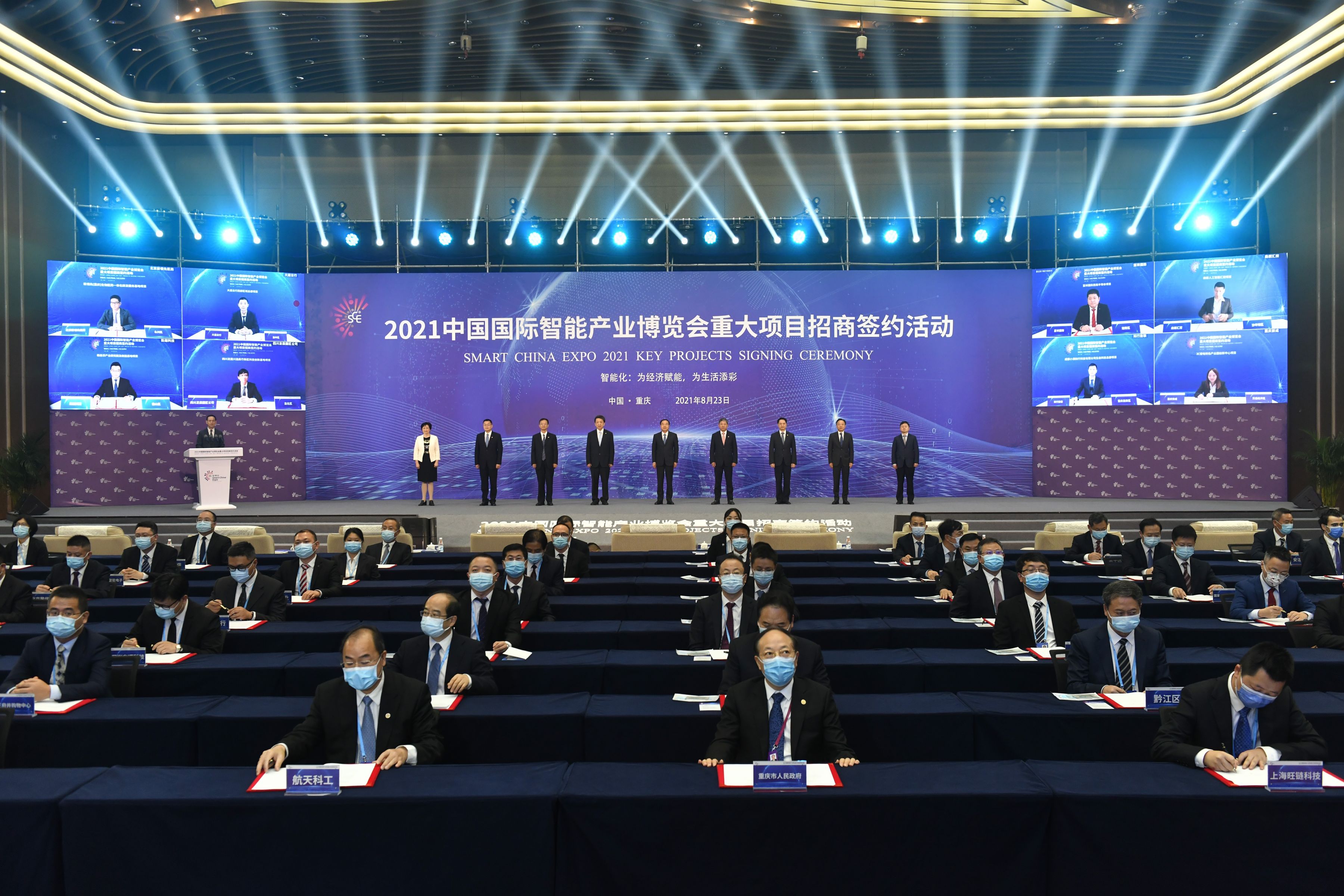 ▲北京新領(lǐng)先陶新華董事長通過線上方式在智博會(huì)永川專場簽約儀式上發(fā)言