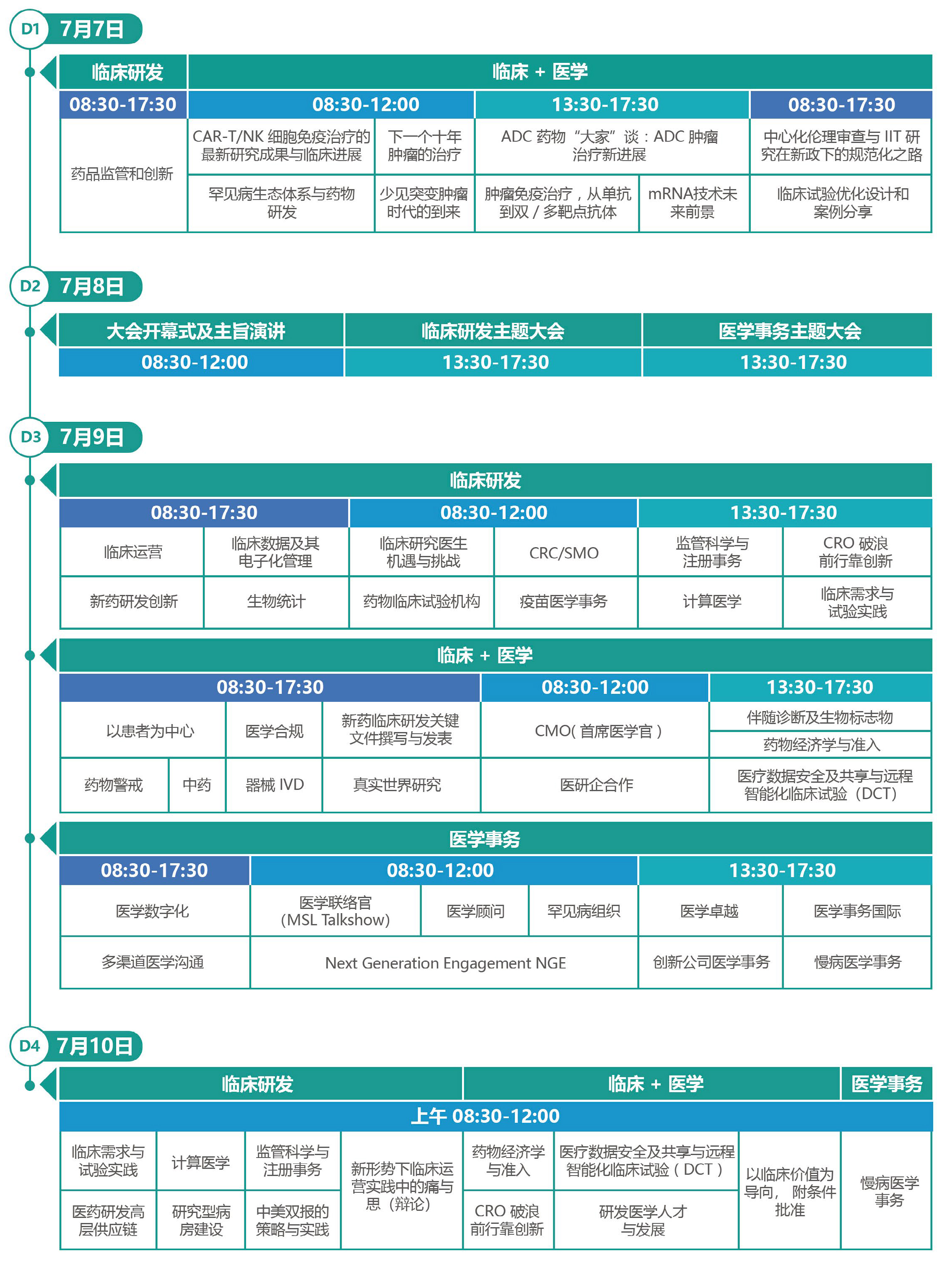 本次會議圍繞藥品監(jiān)管與創(chuàng)新、治療領(lǐng)域醫(yī)學(xué)熱點、臨床研發(fā)、醫(yī)學(xué)事務(wù)等模塊進(jìn)行交流分享,同時設(shè)有12大專題論壇,演講專家達(dá)1000余人,緊跟行業(yè)發(fā)展趨勢,著力于解決參會同仁痛點及難點問題。