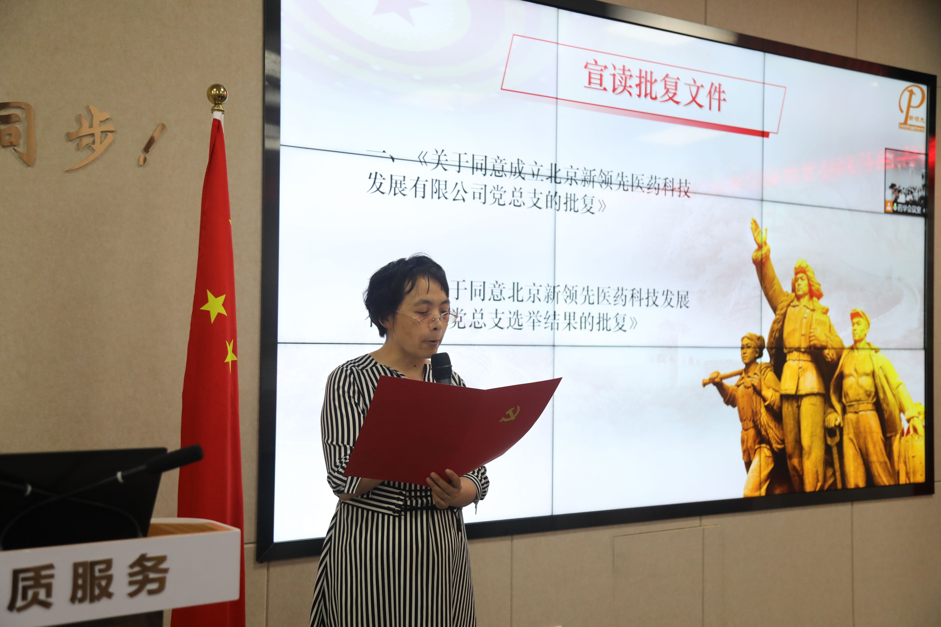 ▲ 黨總支宣傳委員汪六英同志宣讀了中關(guān)村科學(xué)城黨委《關(guān)于同意成立北京新領(lǐng)先醫(yī)藥科技發(fā)展有限公司黨總支的批復(fù)》《關(guān)于同意北京新領(lǐng)先醫(yī)藥科技發(fā)展有限公司黨總支選舉結(jié)果的批復(fù)》。